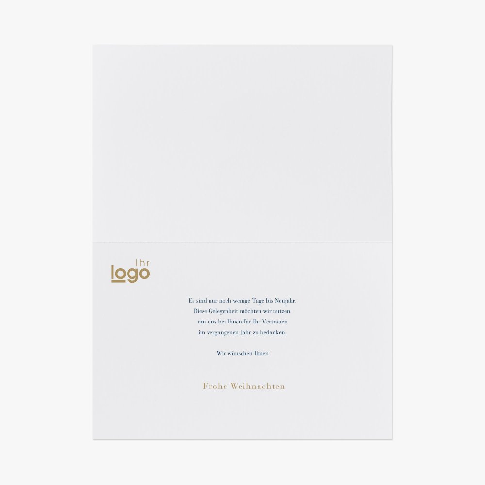 Versenden Sie Ihre Festtagsgrüße mit dieser hochwertigen Grußkarte, die individuell mit Ihrem Logo, Ihren Kontaktdaten, Ihrer Webadresse sowie Ihrem Grußtext gestaltet werden kann.