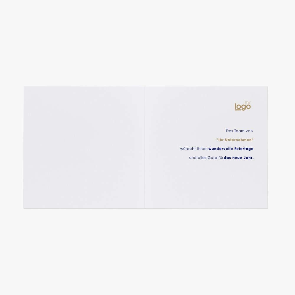 Versenden Sie Ihre Festtagsgrüße mit dieser hochwertigen Grußkarte, die individuell mit Ihrem Logo, Ihren Kontaktdaten, Ihrer Webadresse sowie Ihrem Grußtext gestaltet werden kann.