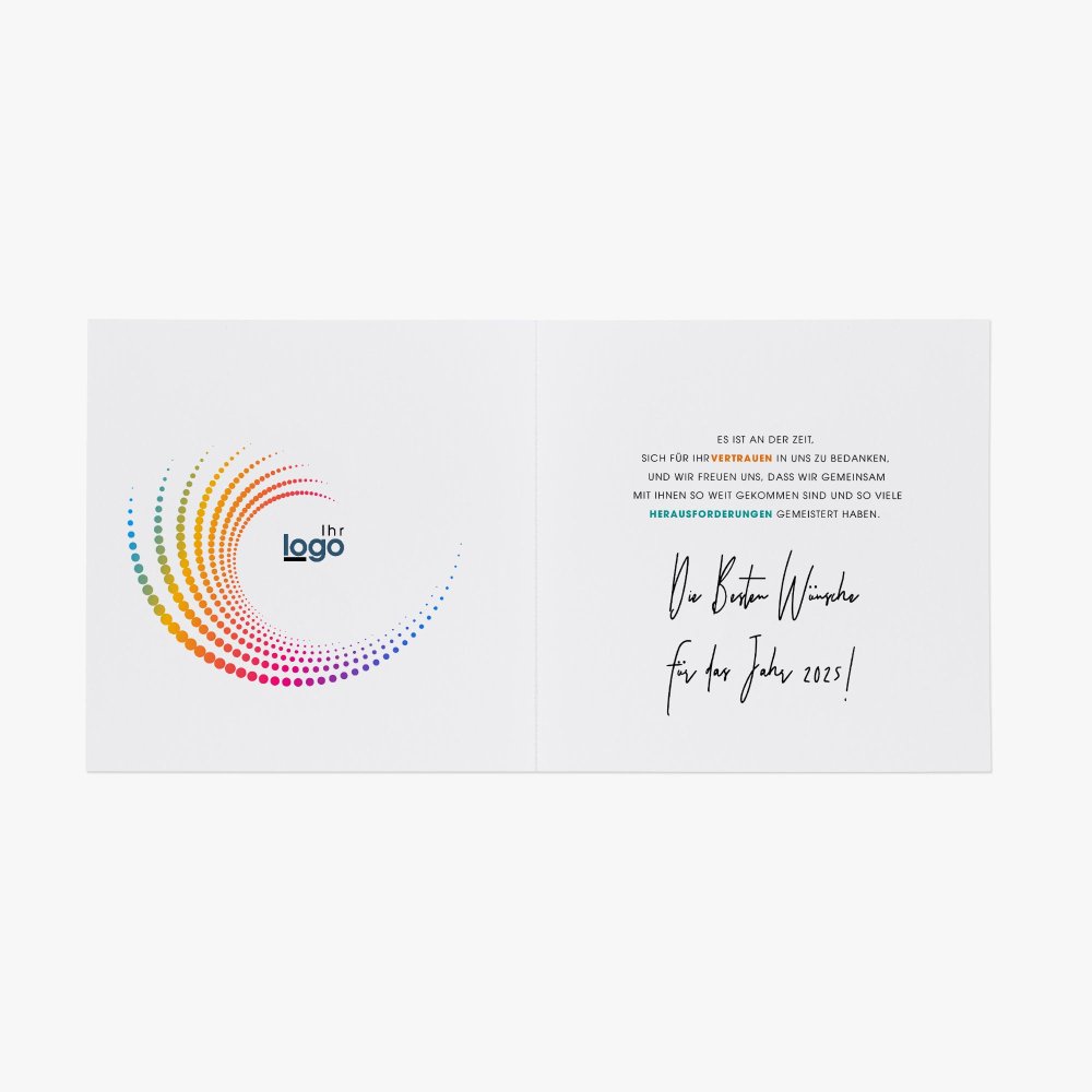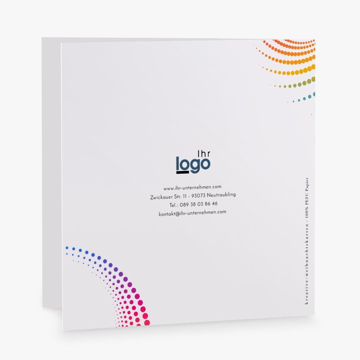 Versenden Sie Ihre Festtagsgrüße mit dieser hochwertigen Grußkarte, die individuell mit Ihrem Logo, Ihren Kontaktdaten, Ihrer Webadresse sowie Ihrem Grußtext gestaltet werden kann.