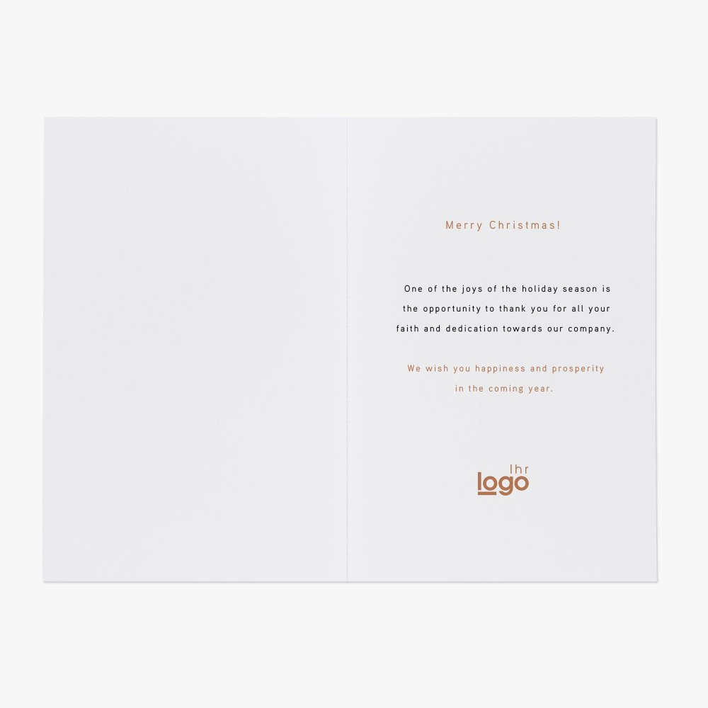 Versenden Sie Ihre Festtagsgrüße mit dieser hochwertigen Grußkarte, die individuell mit Ihrem Logo, Ihren Kontaktdaten, Ihrer Webadresse sowie Ihrem Grußtext gestaltet werden kann.