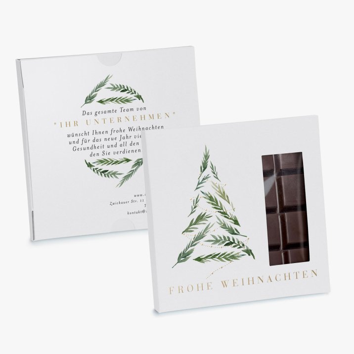Versenden Sie Ihre Weihnachtsgrüße mit einer exklusiven Schokoladentafel in einer personalisierten Hülle. Eine originelle Aufmerksamkeit, die Ihren Geschäftspartnern sicher lange in guter Erinnerung bleibt.